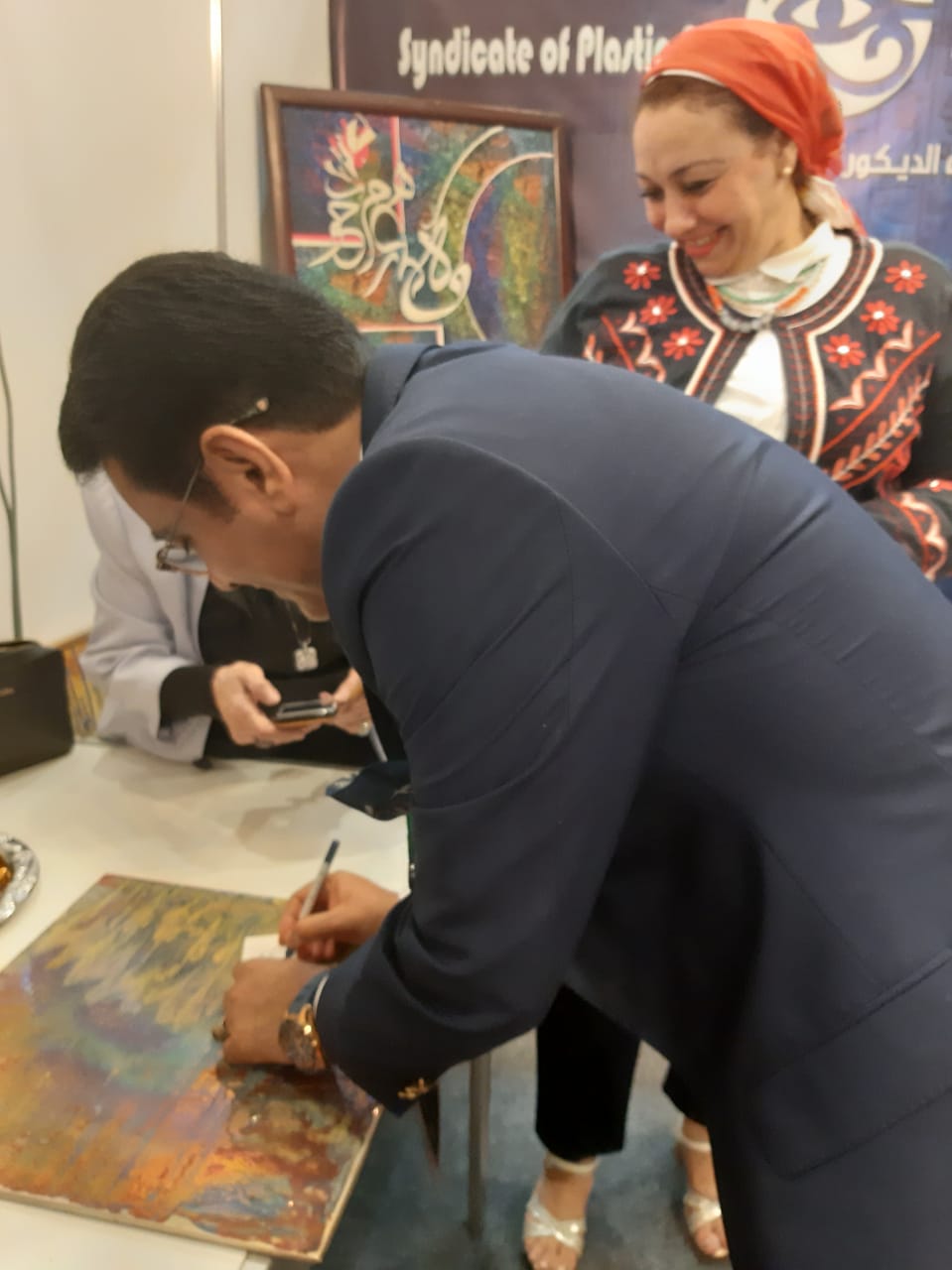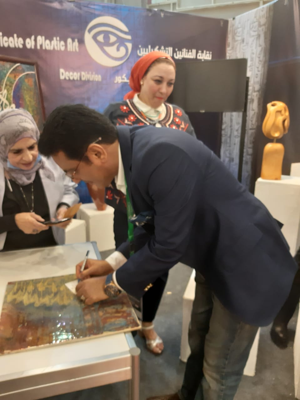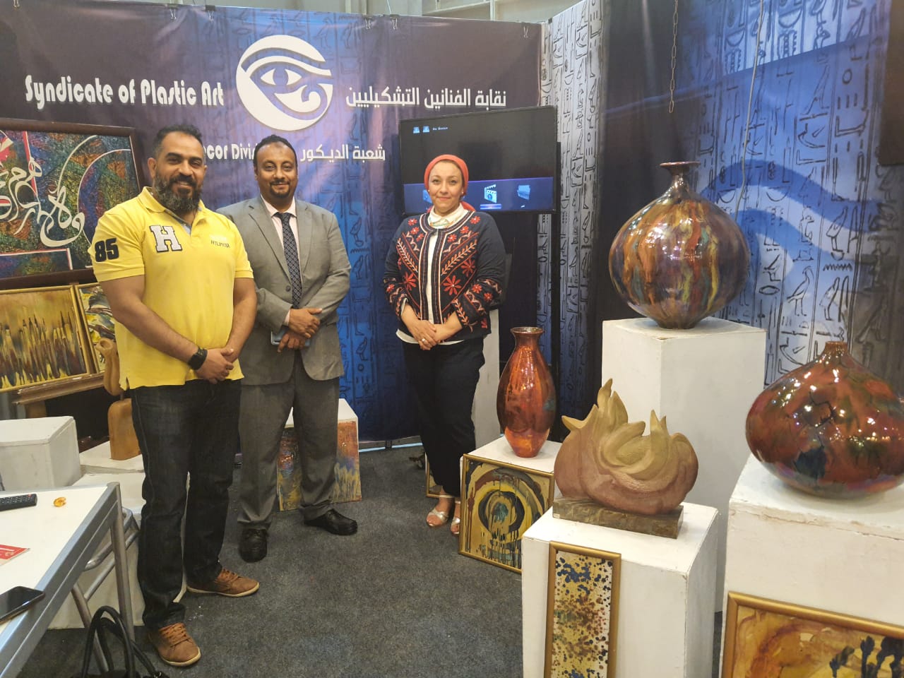 وفي هذا الإطار صرح رئيس الشعبة ومقرر لجنة ممارسة المهنة بنقابة التشكيليين مهندس ديكور «طارق عيد» قائلا: “إن تواجدنا في هذا المعرض الكبير ليس بهدف البيع، فنحن لسنا شركة ولا نملك مصنعاً يقدم منتجات مادية ملموسة ونحن مؤسسة غير هادفة للربح.. وانما منتجنا الأهم والأغلى والأبرز هو الفكرة والإبداع والتصميم والمهارات اليدوية المتفردة.. ومصنعنا هو مصنع بشري.. بمعنى أن الكنز الحقيقي لدى النقابة هو اعضائها المقيدين بشعب الديكور والنحت والتصوير والجرافيك و الخزف”