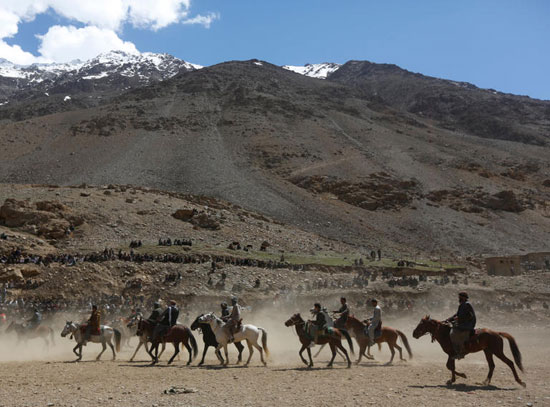 تصطف مجموعة من الخيول والفرسان في ممر جبلي إيذانا ببدء مباراة جديدة من اللعبة الأكثر جماهيرية في أفغانستان.. بزكاشي.