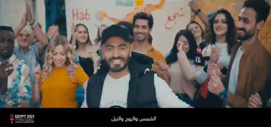 وسيقدم النجم تامر حسنى معه فى العمل مطرب الراب مروان موسى ومطربة صاعده من اكتشافه هدى الشربينى لأداء الجزء الخاص باللغة الإنجليزية والكليب من إخراج أشرف حمدى، واليوم بدأ الفنان تامر حسنى تحضيرات وتجهيزات الاستعراض مع الفريق المصرى والعالمى وسيقام الافتتاح يوم الأربعاء.