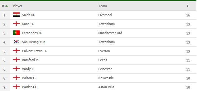 وتقاسم 4 لاعبين المركز الثانى في ترتيب هدافي الدوري الإنجليزي هذا الموسم وهم: برونو فرنانديز نجم مانشستر يونايتد، ونجمى توتنهام هارى كين وهيونج مين سون ومهاجم إيفرتون دومينيك كالفيرت ليوين برصيد 13 هدفا.