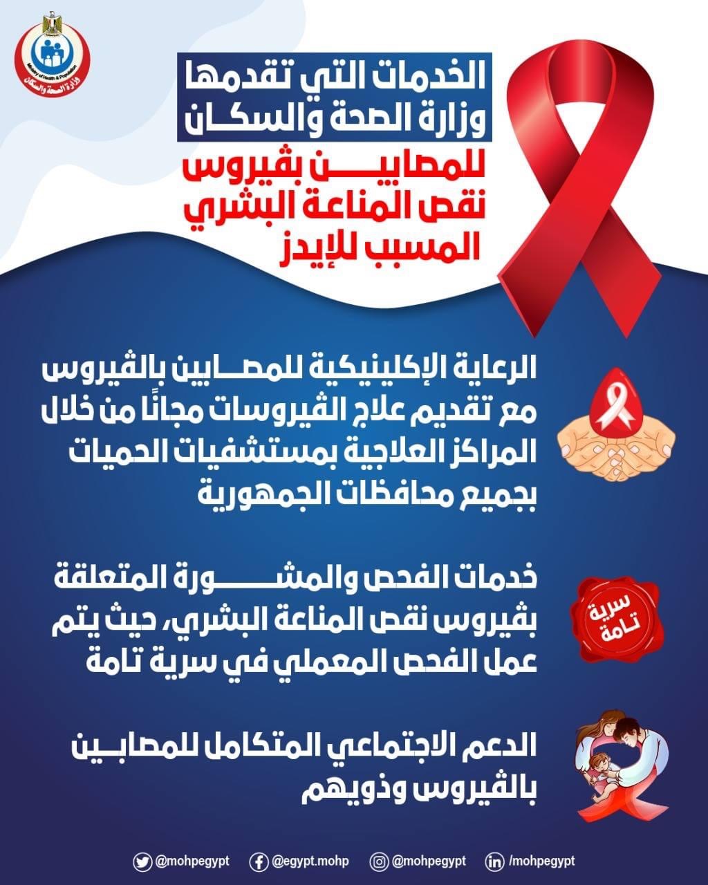 كشفت وزارة الصحة والسكان عن الخدمات التى تقدمها الوزارة للمصابين بفيروس نقص المناعة البشرى حيث تضمن الرعاية الإكلينيكية مع تقديم العلاج مجانا مع عمل الفحوص المجانية.