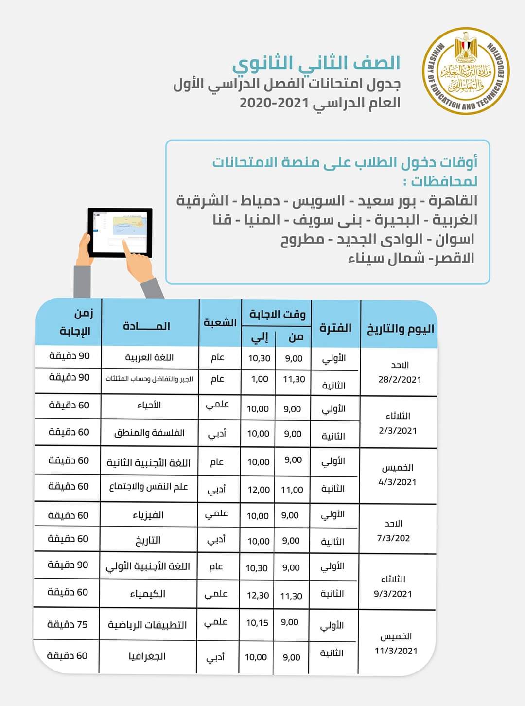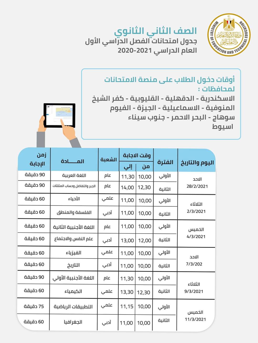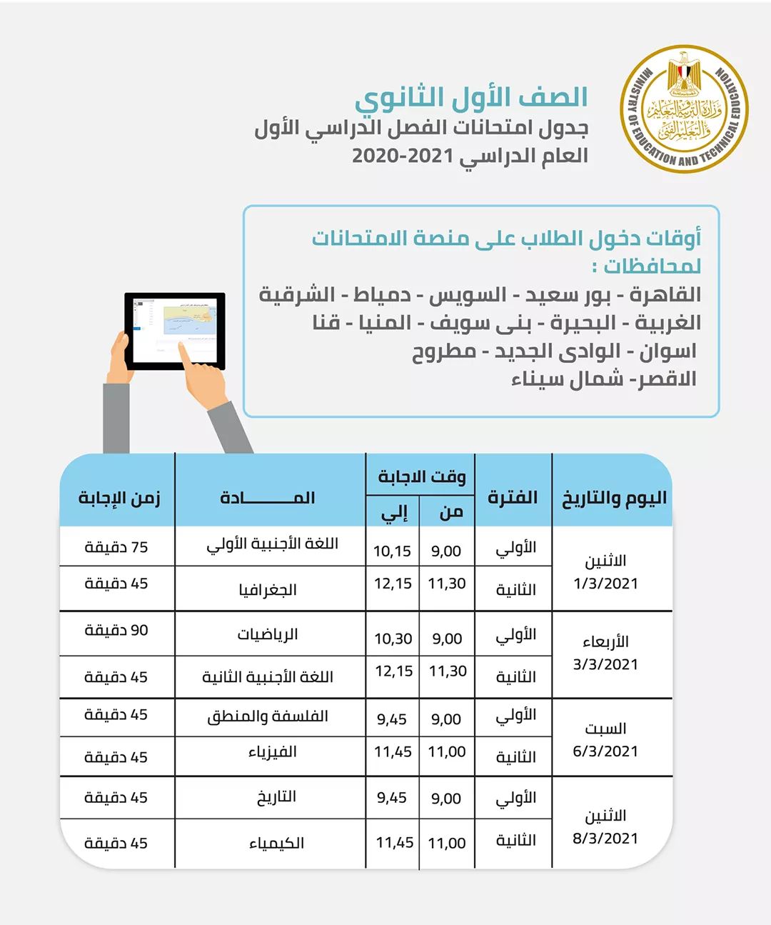 قررت وزارة التربية والتعليم والتعليم الفني إجراء الامتحانات الإلكترونية للصفين الأول والثاني الثانوي بتعديل طفيف في المواعيد يضمن تخفيف الأحمال على شبكات الاتصالات، وعليه فإن الطلاب في المحافظات المبينة سوف يستكملون الامتحانات وفقا للجداول المرفقة.
