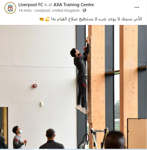 نشر الحساب الرسمي لفريق ليفربول الإنجليزى، المحترف فى صفوفه النجم المصرى محمد صلاح، مجموعة من الصور لتدريبات الفريق، وأبرز خلالها لقطات لتدريبات محمد صلاح بشكل خاص، وذلك خلال أدائه تمرينات الإعداد البدنى، وظهر نجم منتخب مصر وليفربول محمد صلاح يتسلق الحائط فى أحد التدريبات، وعلقت صفحة ليفربول عليها، “لا يوجد شىء لا يستطيع القيام به”، فى إشارة لمحمد صلاح.