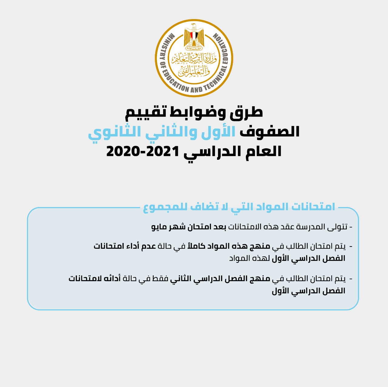 – امتحانات المواد التى لا تضاف للمجموع تتولى المدرسة عقدها وذلك بعد امتحانات شهر مايو على مستوى المدرسة وتحت إشراف الإدارة التعليمية، والطلاب الذين لم يسبق لهم أداء هذه الامتحانات قبل توقف الدراسة يتم امتحانهم فى المنهج كاملاً، أما الطلاب الذين سبق لهم أداء هذه الامتحانات قبل توقف الدراسة يتم امتحانهم فى منهج ومقرر الصف الفصل الدراسى الثانى فقط.