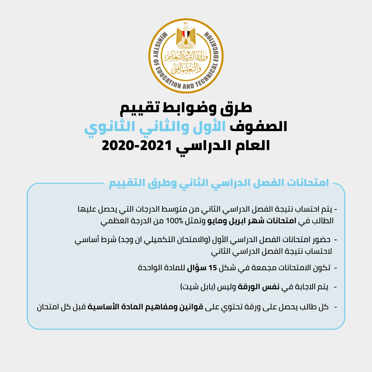 أعلنت وزارة التربية والتعليم والتعليم الفني، عن طرق وضوابط التقييم لطلاب الصف الأول والثانى الثانوى للعام الدراسى 2021-2020.