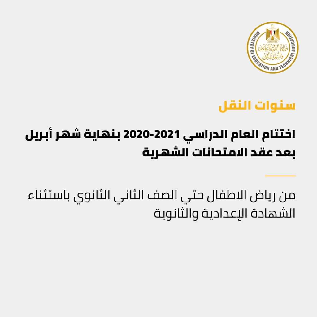 أعلنت وزارة التربية والتعليم والتعليم الفني، وذلك بعد التشاور مع رئيس الوزراء والأجهزة المعنية وعلى رأسها وزارة الصحة والسكان، أن تكون نهاية شهر أبريل الجارى هى نهاية العام الدراسى لسنوات النقل من رياض الأطفال حتى الصف الثانى الثانوى باستثناء الشهادتين الإعدادية والثانوية.