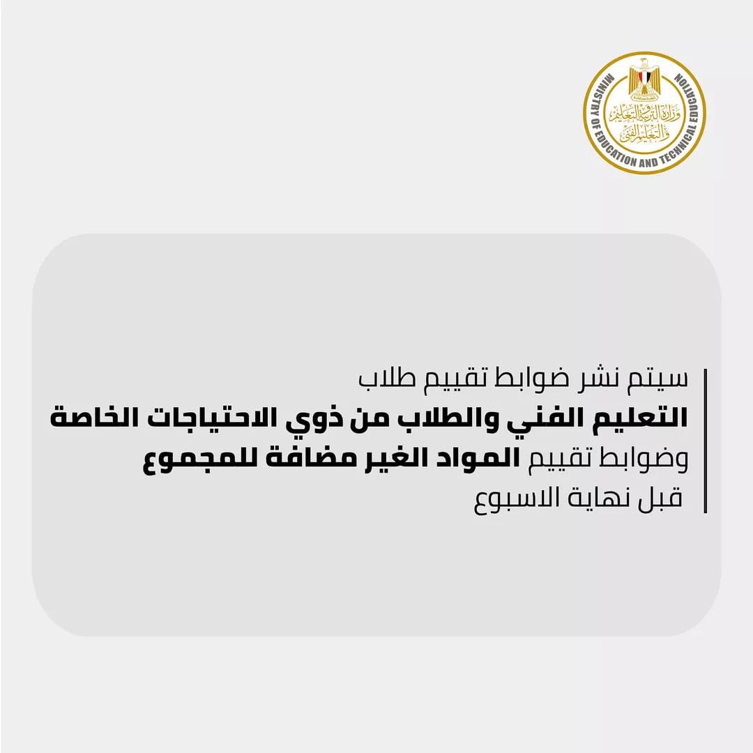سيتم نشر ضوابط تقييم طلاب التعليم الفنى وضوابط تقييم المواد الغير مضافة للمجموع وضوابط تقييم الطلاب من ذوى الاحتياجات الخاصة قبل نهاية الأسبوع.