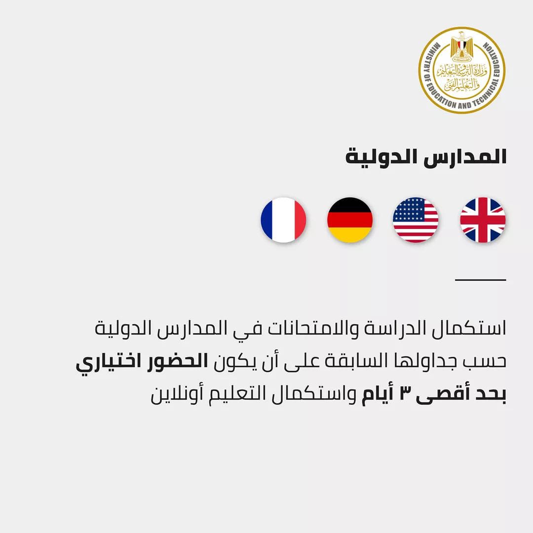وتستكمل المدارس الدولية الدراسة والامتحانات حسب جداولها المخططة سابقًا مع التشديد على منح أولياء الأمور حرية الاختيار فيما يتعلق بحضور أبنائهم وأن تقتصر أيام الحضور على 3 أيام بحد أقصى واستكمال التعلم أونلاين.