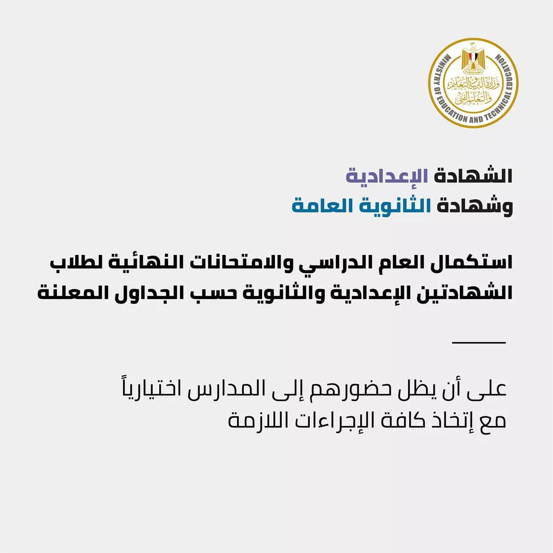 ويتم استكمال العام الدراسى لطلاب الشهادتين الإعدادية والثانوية والامتحانات النهائية للشهادتين حسب الجداول المعلنة على أن يظل حضورهم إلى المدارس اختياريًا وعلى أن تقوم الدولة بكافة الإجراءات الاحترازية لطلاب الشهادات العامة أثناء الامتحانات التجريبية والنهائية.