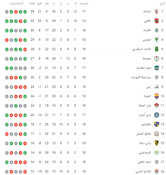 شهد ترتيب الدورى المصري بعد مباريات الإثنين مواصلة الزمالك تصدره للجدول برصيد 39 نقطة بعد الفوز علي نظيره البنك الأهلي بأربعة أهداف مقابل هدف في المباراة التي جمعتهما ضمن مباريات الجولة الـ 17 على استاد القاهرة.