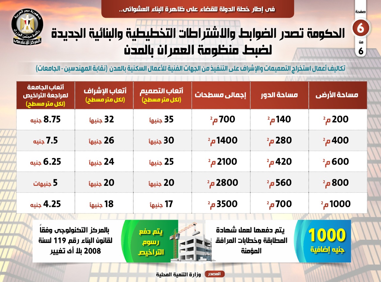 وفى حال مساحة الأرضى البالغة 1000 م2، أى مساحة الدور 700 م2، بإجمالى مسطحات 3500 م2، فتتمثل تكلفة تراخيص كل متر مسطح فى 17 جنيهًا أتعاب التصميم، و18 جنيهًا لأتعاب الإشراف، و4.25 جنيه أتعاب الجامعة لمراجعة التراخيص.