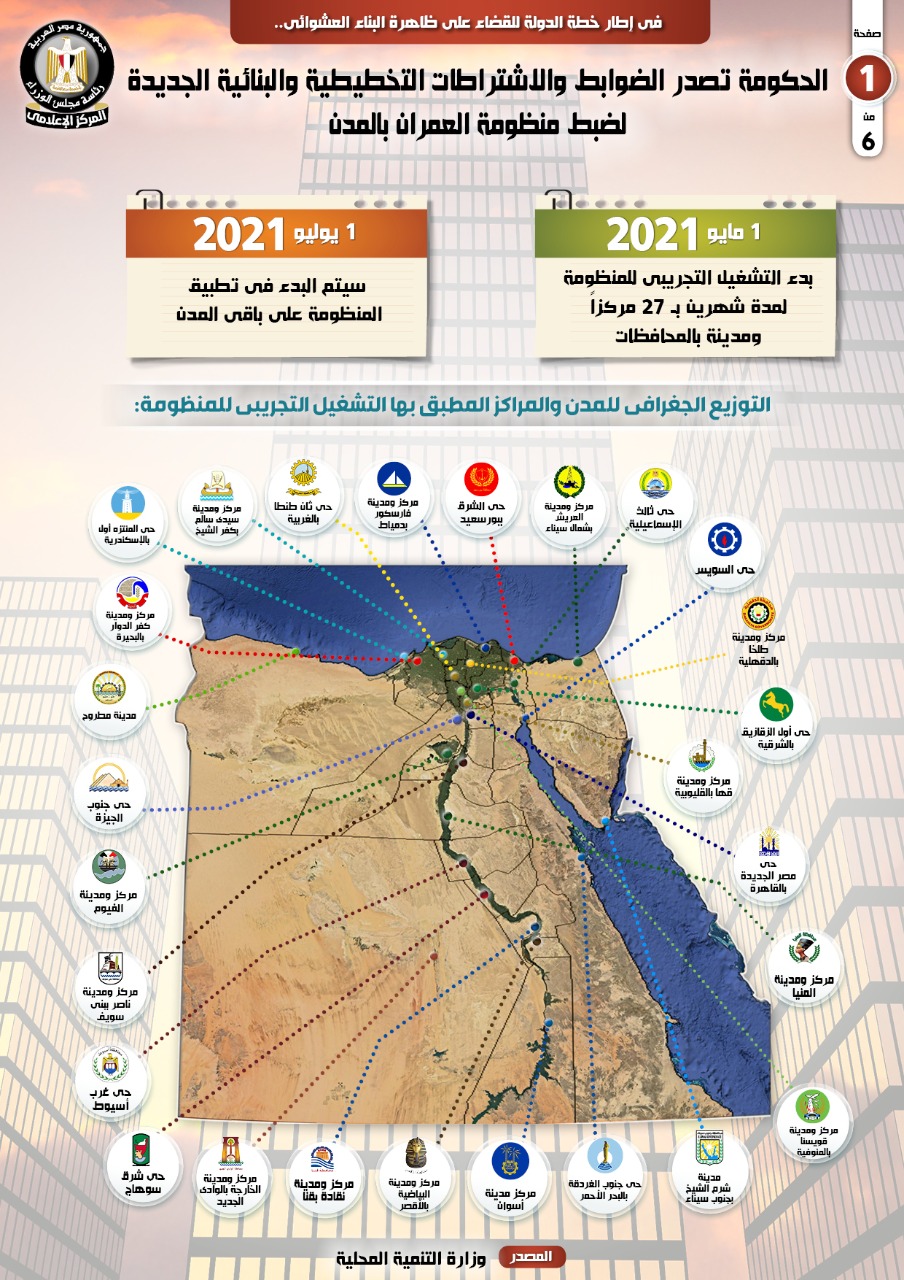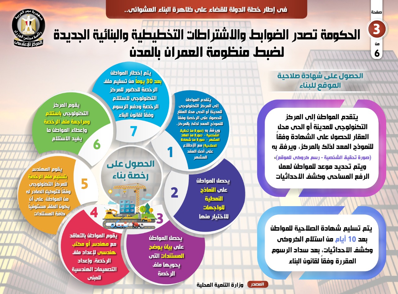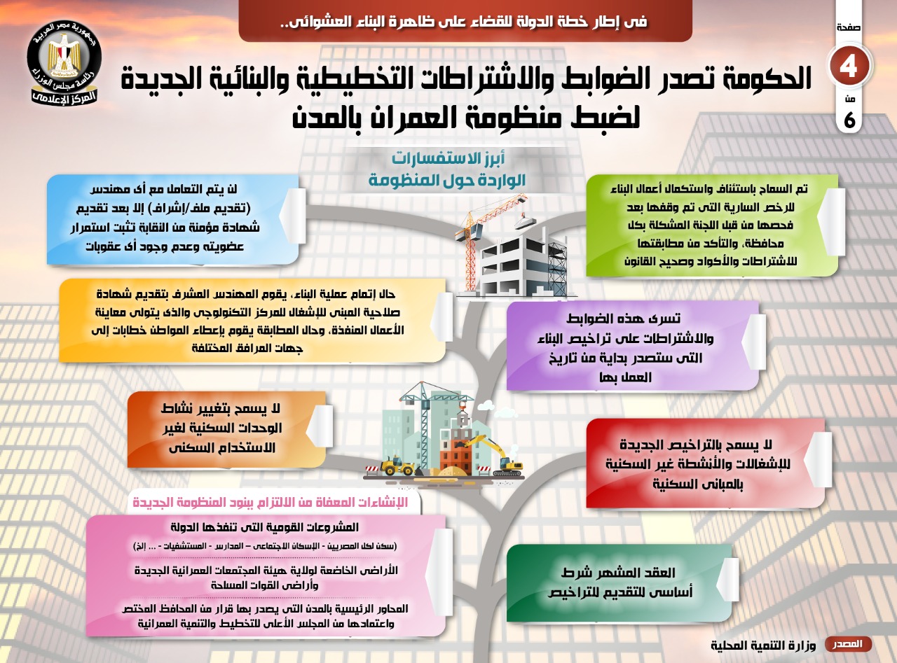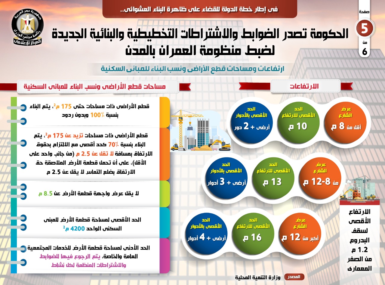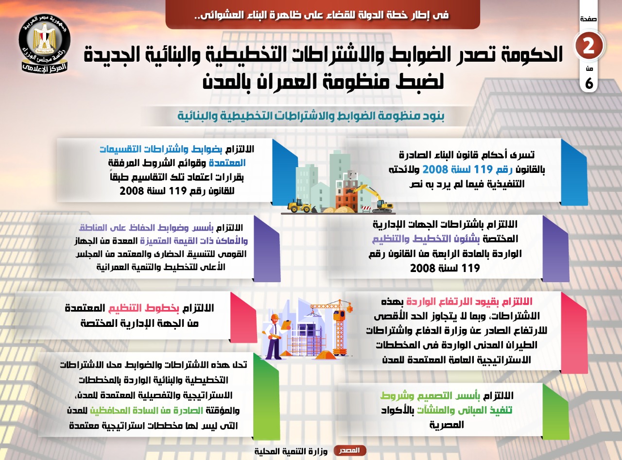 وفى هذا الصدد، نشر المركز الإعلامى لمجلس الوزراء، تقريرًا تضمن إنفوجرافات تسلط الضوء على الضوابط والاشتراطات التخطيطية والبنائية الجديدة التى أصدرتها الحكومة لضبط منظومة العمران بالمدن، وذلك فى إطار خطة الدولة للقضاء على ظاهرة البناء العشوائي.
