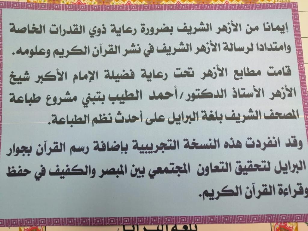 هذه النسخة التجريبية من مصحف الأزهر الشريف بطريقة «برايل» أُعدت وطُبعت بمجمع مطابع الأزهر، وانفردت النسخة التجريبية من المصحف بإضافة رسم القرآن بجوار «البرايل» لتحقيق التعاون المجتمعي بين المبصر والكفيف في حفظ وقراءة القرآن الكريم، وجاءت هذه الخطوة من الأزهر إيمانا من المؤسسة العريقة بضرورة رعاية ذوي القدرات الخاصة والمكفوفين وامتدادًا لرسالة الأزهر الشريف في نشر القرآن الكريم وعلومه.