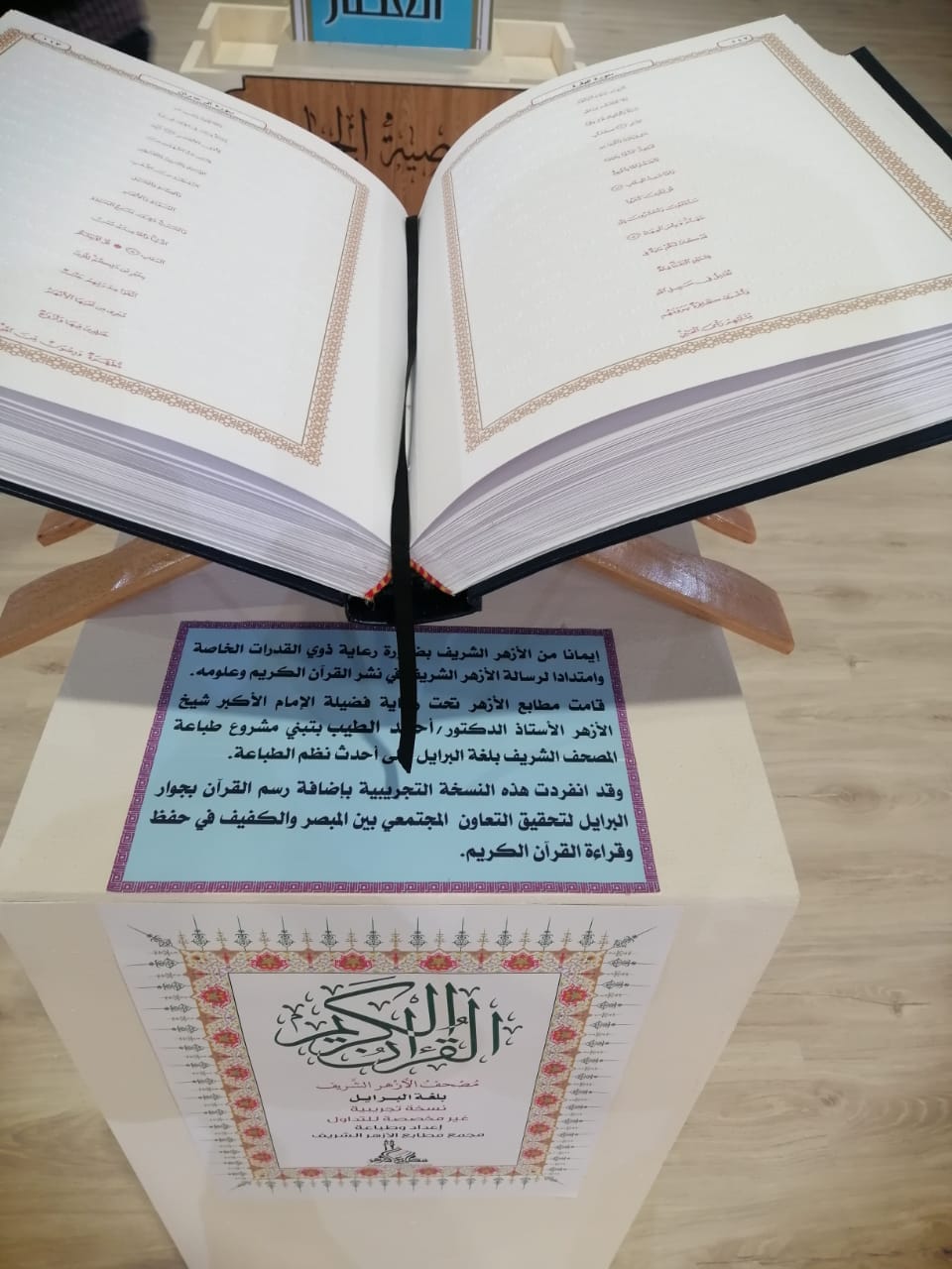 وتم توفير نسخة من مصحف الأزهر الشريف بطريقة «برايل» لزوار جناح الأزهر بمعرض القاهرة الدولي للكتاب في نسخته (53)، حيث قامت مطابع الأزهر تحت رعاية فضيلة #الإمام_الأكبر أ.د أحمد #الطيب، #شيخ_الأزهر الشريف، بتبني مشروع طباعة المصحف الشريف بطريقة «برايل» على أحدث نظم الطباعة.